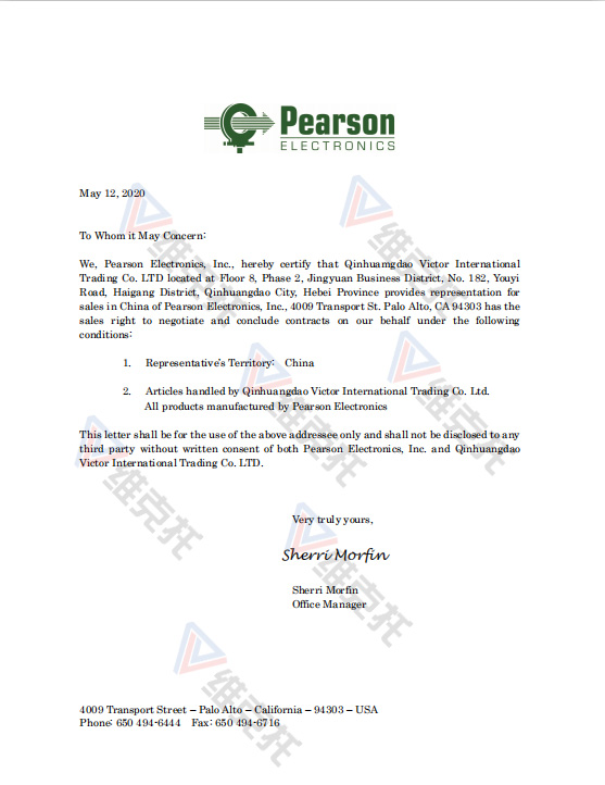 秦皇島維克托國際貿(mào)易有限公司于2020年5月12日取得了Pearson Electronics(皮爾遜電子)公司產(chǎn)品的代理權。我們是Pearson中國區(qū)代理商。主要代理產(chǎn)品有Pearson電流互感器、Pearson電流監(jiān)控器等。如果您有Pearson Electronics(皮爾遜電子)產(chǎn)品的采購需求,請與我們聯(lián)系,我們會竭誠為您服務!